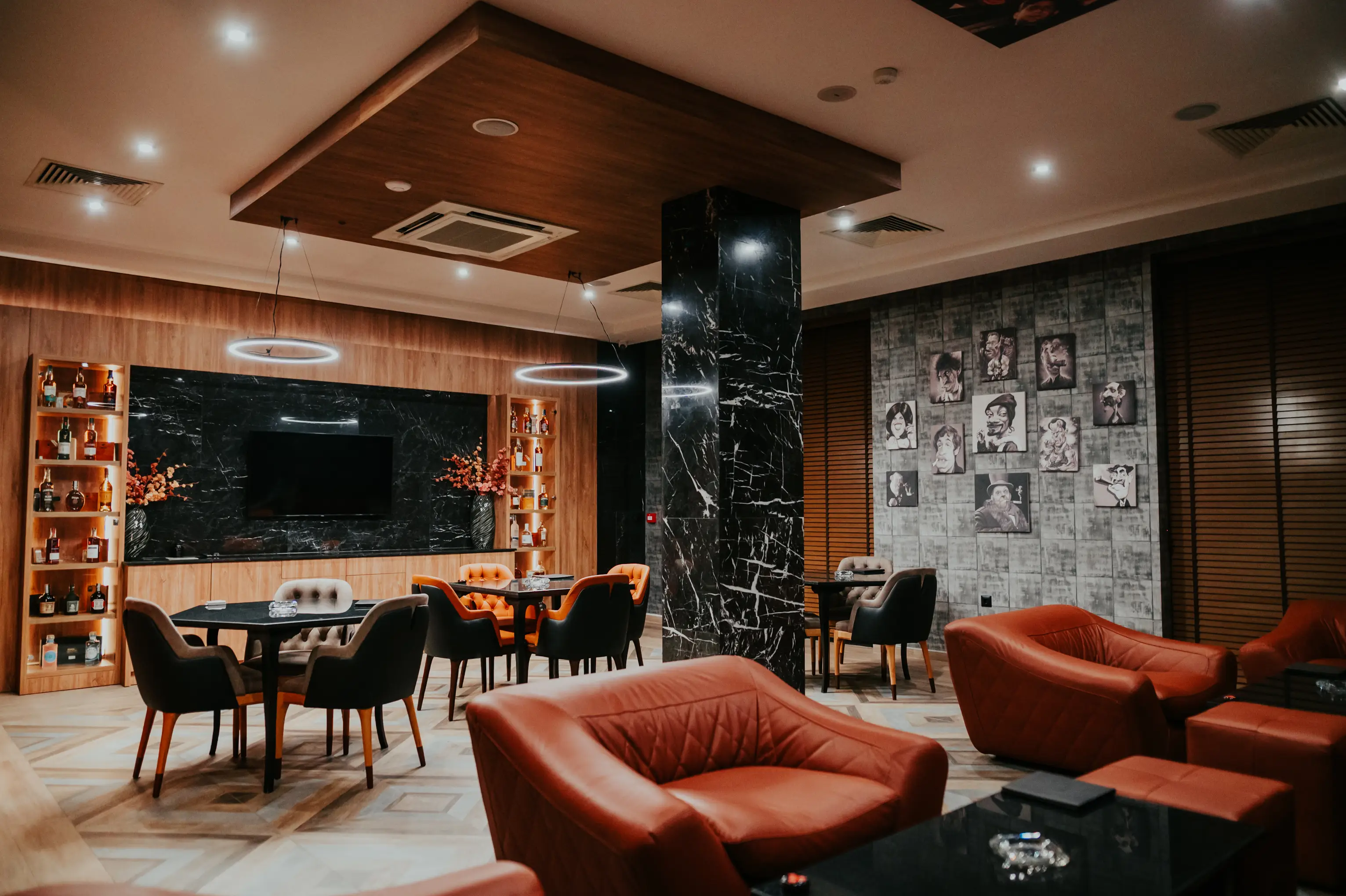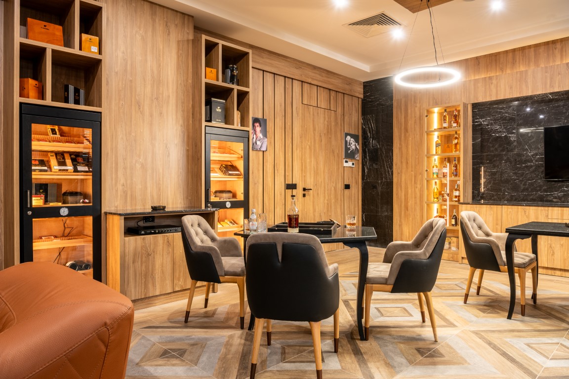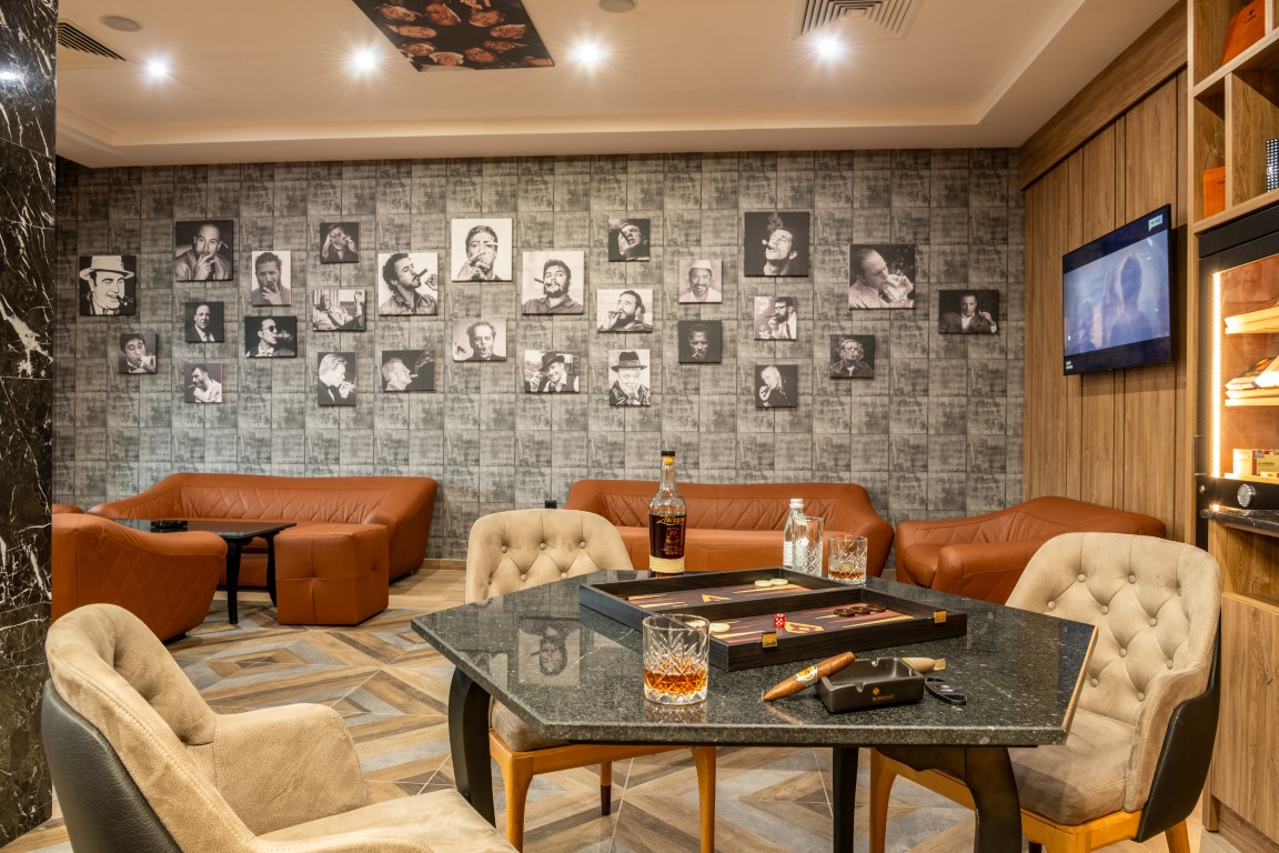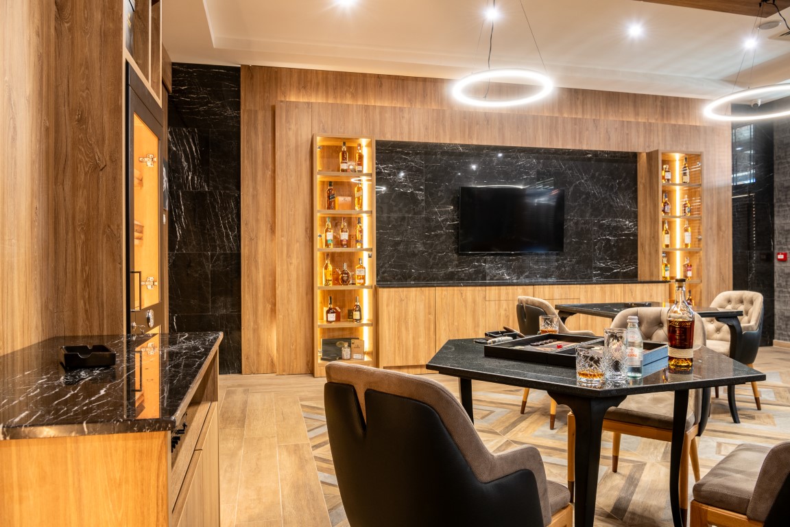 Комфортна и луксозна зона със стилна атмосфера за любителите на уиски или по-малки екипи, които търсят място за градивна дискусия или тихи игри. Залата разполага с мека мебел и два 65" LED TV, на които може да се стриймва свободно медия.